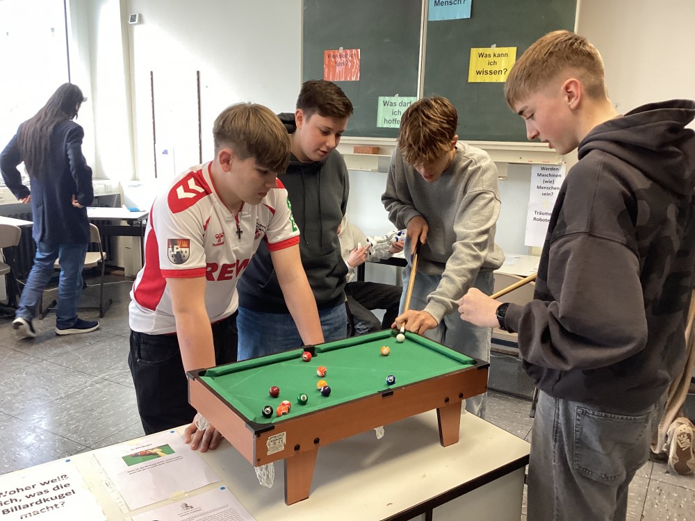 Besonders schön war, dass jeder Tisch nicht nur eine Frage hatte, sondern auch passende Gegenstände, die das Thema lebendiger machten. Dadurch konnte man eine visuelle Vorstellung gewinnen, was das Nachdenken viel einfacher – und irgendwie spannender – gestaltet hat. So wurden zum Beispiel mit einer kleinen Spielzeug-Eisenbahn und Figuren ein klassisches moralisches Dilemma dargestellt, um die Frage anschaulich zu machen. Mit einem echten Billardtisch konnte uns David Humes Erkenntnisskeptizismus vor Augen geführt werden, dass auch scheinbar selbstverständliche Folgen nach Ursachen – wie der Lauf einer Billardkugel nach dem Anstoß – letztlich nur auf der Macht der Gewohnheit beruhen, an sich aber zweifelhaft bleiben. Zu jeder Frage lag zudem ein philosophischer Text als Grundlage für das Gedankenexperiment anbei.