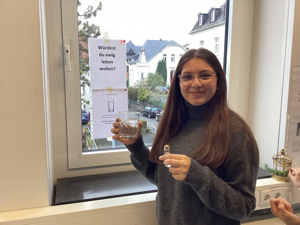 Man hat wirklich gemerkt, wie viel Mühe in jeder Station steckte, und genau das hat das Philosophieren noch interessanter gemacht. Wir konnten uns völlig frei entscheiden, mit welcher Frage wir beginnen. Die Blätter blieben immer auf den Tischen liegen, sodass jeder nur die Antworten derjenigen sehen konnte, die bereits vor einem an diesem Tisch waren. Das war besonders spannend, weil man dadurch direkt verschiedene Gedanken und Perspektiven vergleichen konnte – aber eben nicht alle auf einmal, sondern nur Stück für Stück. So war jede Station wie ein kleines eigenes Gespräch mit den Personen, die vorher dort waren. Bei jeder Frage mussten wir „Ja" oder „Nein" ankreuzen und begründen, warum wir uns so entschieden haben. Manche Fragen waren leicht, andere haben uns richtig zum Nachdenken gebracht. Besonders interessant war für mich die Frage, ob es Gott gibt. Auch hier konnte man sehen, wie unterschiedlich Menschen fühlen und denken – und wie vielfältig die Gründe dafür sind. Insgesamt war das Philosophielabor eine tolle Erfahrung. Es war nicht einfach nur Unterricht, sondern ein echtes Erkunden der eigenen Gedankenwelt. Durch die vielen liebevoll vorbereiteten Details, die Freiheit bei der Auswahl der Fragen und die Einblicke in die Ansichten anderer wurde das Ganze zu etwas Besonderem. Ich fand es wirklich schön zu sehen, wie viel Arbeit und Kreativität Herr Dr. Kremer und die Fachschaft Philosophie/Ethik in diesen Projekttag gesteckt haben. Sie haben uns gezeigt, dass Philosophieren nicht trocken oder abstrakt sein muss, sondern lebendig, persönlich und überraschend abwechslungsreich.