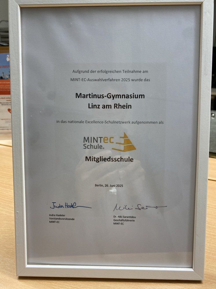 Am Anfang der Ferien erreichte uns eine tolle Nachricht: Das Martinus-Gymnasium wird aufgrund seines hervorragenden MINT-Schulprofils ab diesem Schuljahr eine MINT-EC-Schule. Als eine von deutschlandweit nur sechs Schulen konnte das Martinus-Gymnasium im MINT-EC-Auswahlverfahren 2025 überzeugen und wurde in das nationale Excellence-Schulnetzwerk MINT-EC aufgenommen, das nun 348 Schulen mit 350.00 Schülerinnen und Schülern sowie 29.500 Lehrkräften umfasst.