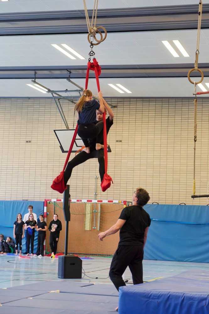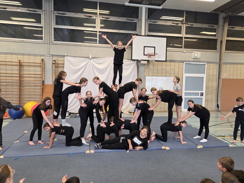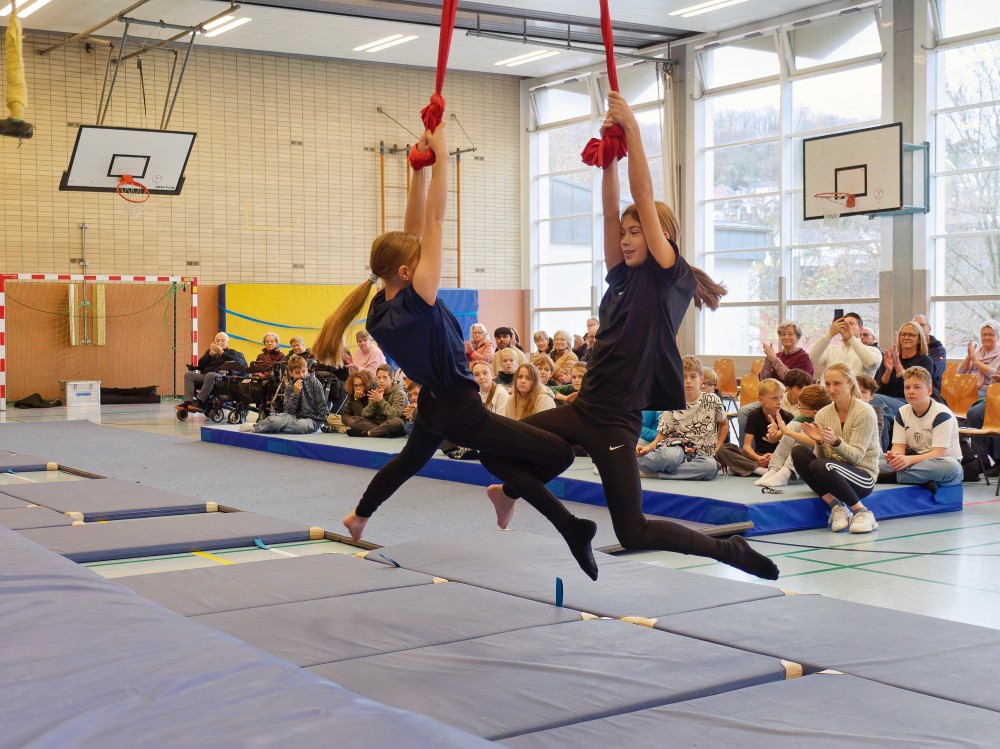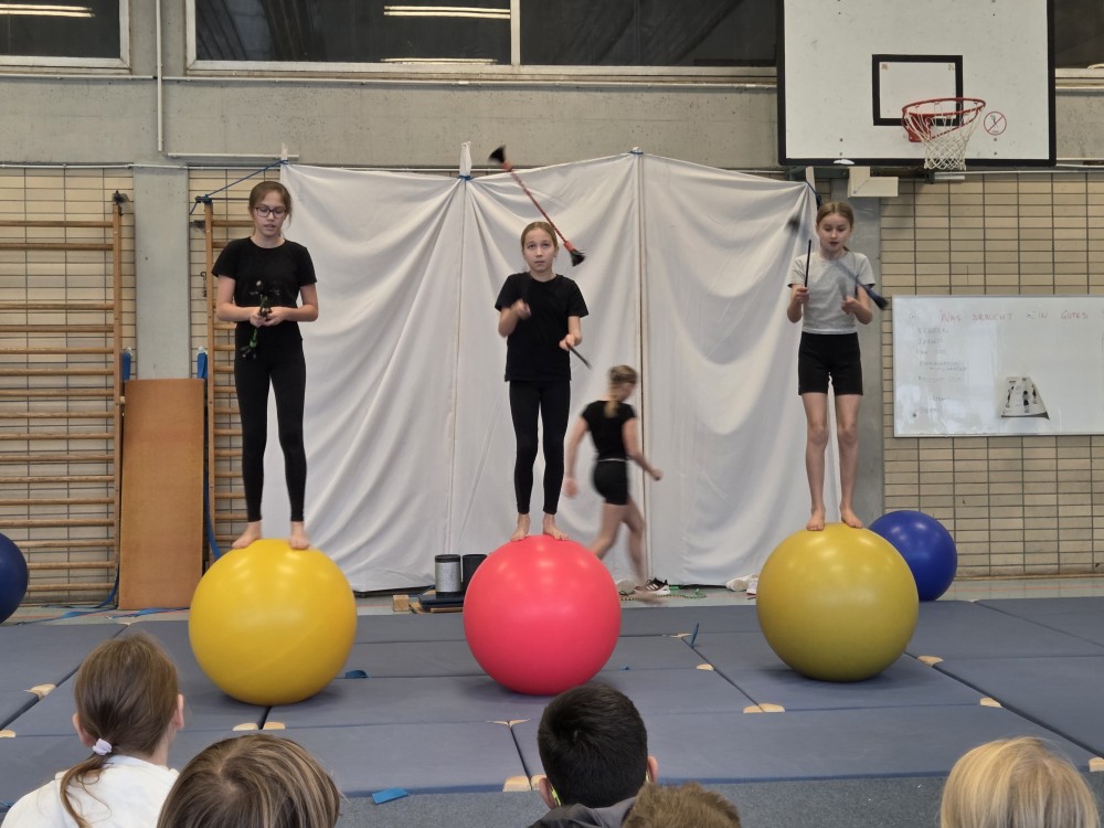 Im Rahmen der landesweiten Demographiewoche Anfang November waren rund 40 Bewohnerinnen und Bewohner aus mehreren Linzer Seniorenheimen zu Gast am Martinus-Gymnasium, wo ihnen die Zirkus-AG eine bunte Show bot. Begeistert verfolgten die Seniorinnen und Senioren die Kunststücke, die die Kinder am Trapez, am Vertikaltuch oder auf den Laufbällen zeigten. Da wurden Räder geschlagen und Pyramiden gebaut, es flogen Diavolos und Flower Sticks durch die Luft.
